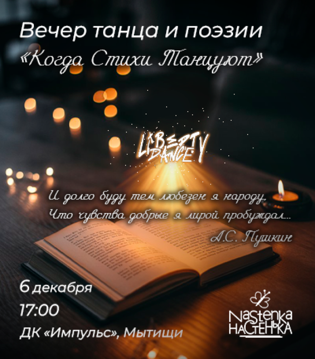 6 декабря ДК «Импульс» в г. Мытищи станет сценой для нашего благотворительного танцевально-поэтического вечера «Танец под стихи».