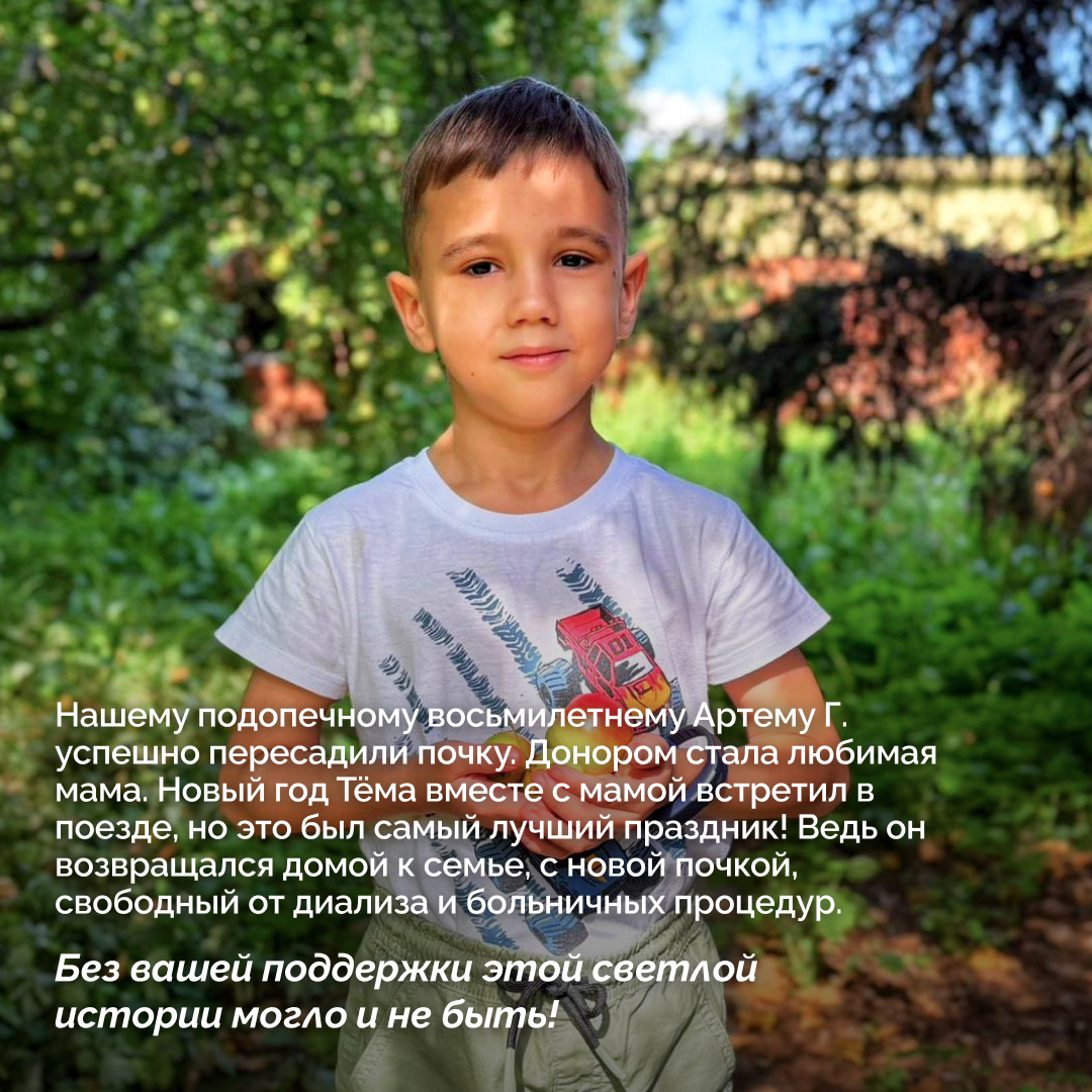 В рамках проекта было израсходовано 716 871 рублей на аренду 4 квартир, оплату коммунальных платежей, закупку дополнительного оборудования. Благодаря проекту 13 семей получили возможность бесплатно проживать в квартирах в ожидании пересадки почки.