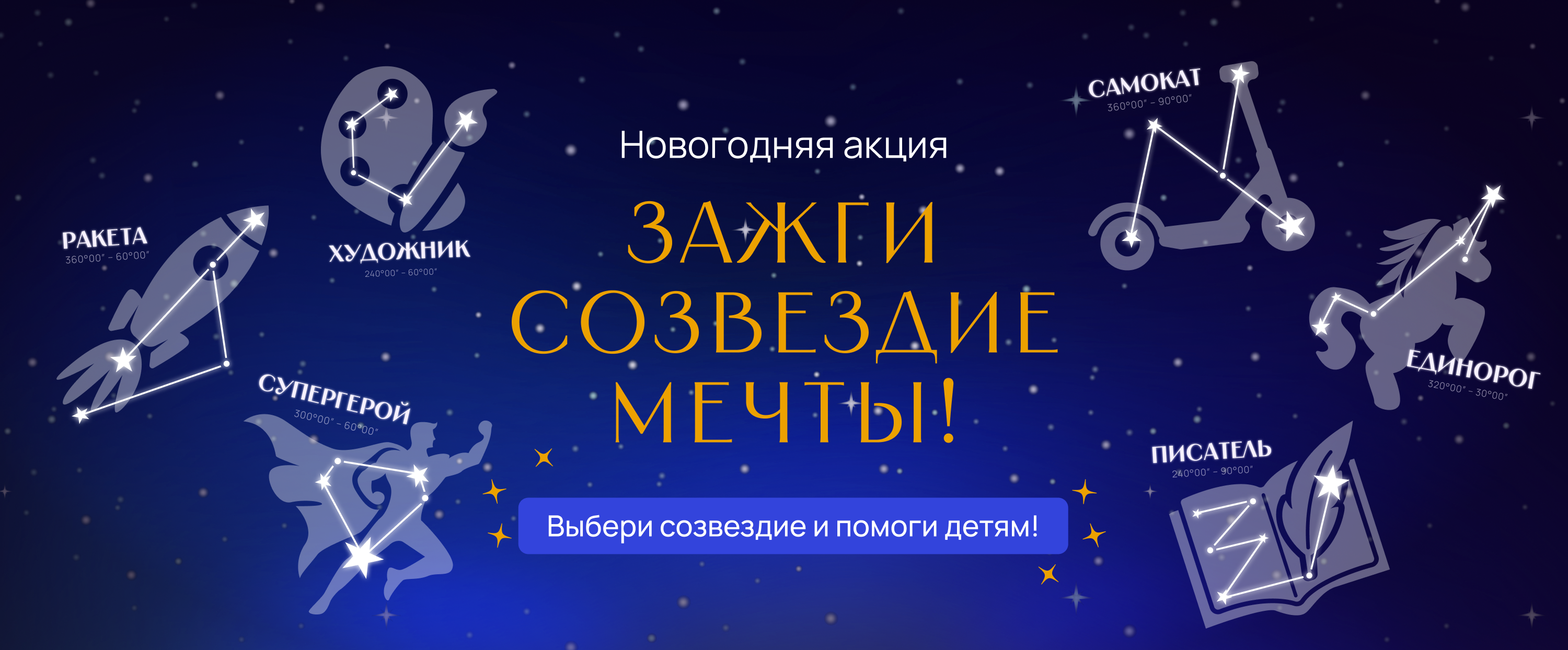 Станьте частью доброй новогодней истории с 8 декабря 2025 до 15 января 2026 года. Пусть звездное небо светится ярко, а мечты наших подопечных сбудутся с вашей помощью.
